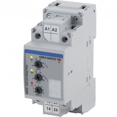 DUB72 is a DC double under-voltage-thresholds monitoring relay, with two independent relays, one for each of the 2 thresholds, measuring the level of its power supply.