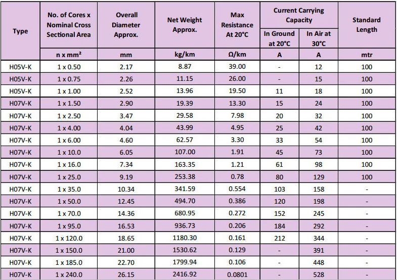H05V-K : 300/500V H05V-K : 1500V 70°C H07V-K : 450/750V H07V-K : 2500V SHORT CIRCUIT TEMPERATURE